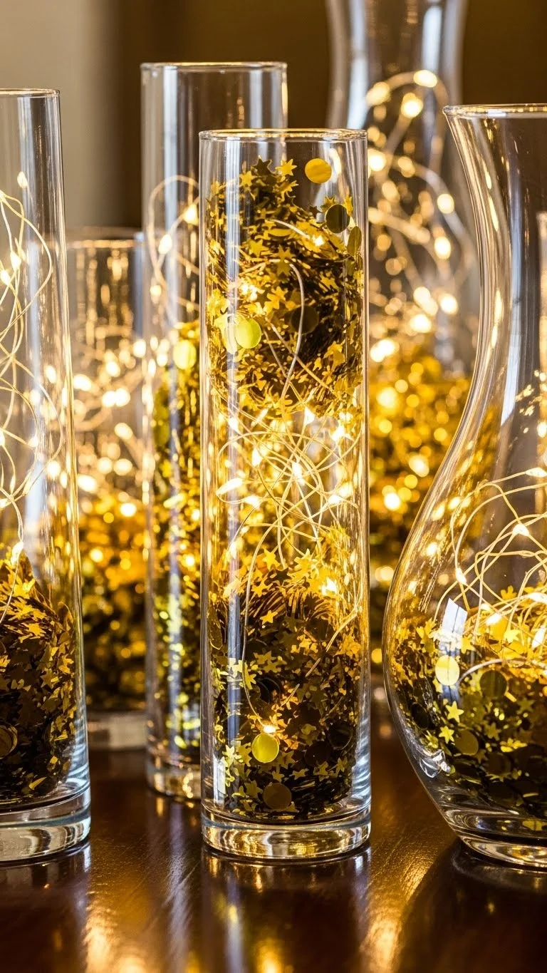 Fill clear vases with gold confetti and battery lights for a sparkling display. Layer with ornaments or small greenery for contrast. This is a budget-friendly approach to glam decor, perfect for tables or shelves. Confetti adds shimmer without heavy metallic objects, keeping the display lightweight and flexible.