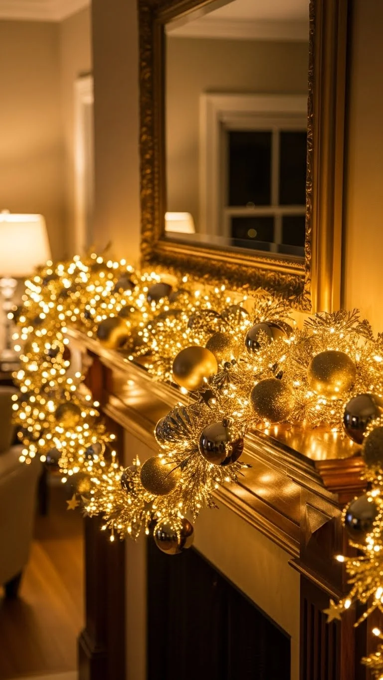 Drape metallic gold garlands along your mantel to create instant festive glamour. Mix in gold ornaments or beads for depth. Add warm string lights to enhance the sparkle. Choose a pre-made garland or make your own by combining gold ribbons, tinsel, and baubles. This simple addition turns your fireplace into a holiday focal point without requiring extensive effort.