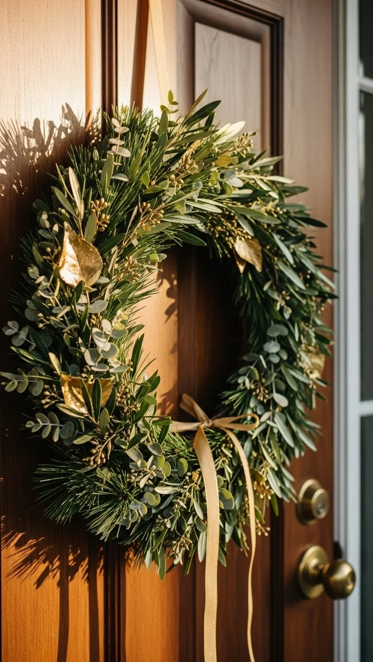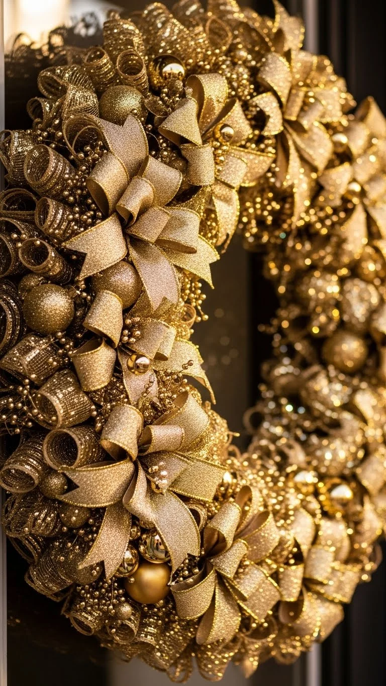 Make a wreath entirely from gold ribbons for a bold entrance statement. Layer ribbons for fullness and tuck in small ornaments for detail. This DIY is inexpensive, reusable, and instantly eye-catching. Hang on doors or walls to signal festive glamour and tie in other gold accents throughout the home.