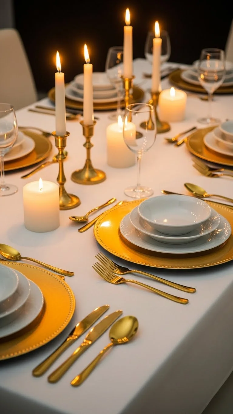 Use gold flatware and chargers to create an elegant table setting. Pair with simple white dishes to let metallics shine. Affordable DIY alternatives include spray-painting old utensils or using gold-plated disposable options for parties. Metallic tableware adds refinement and enhances the glam holiday atmosphere.