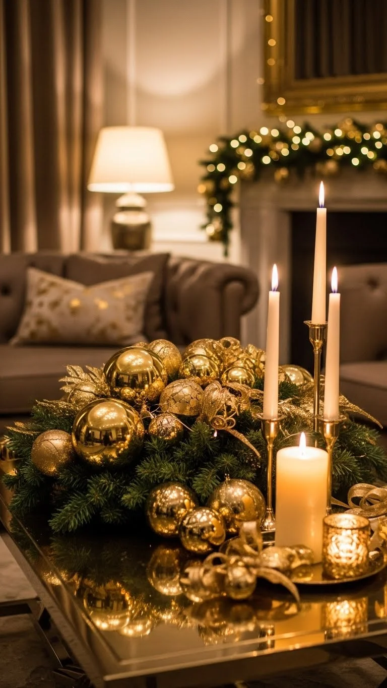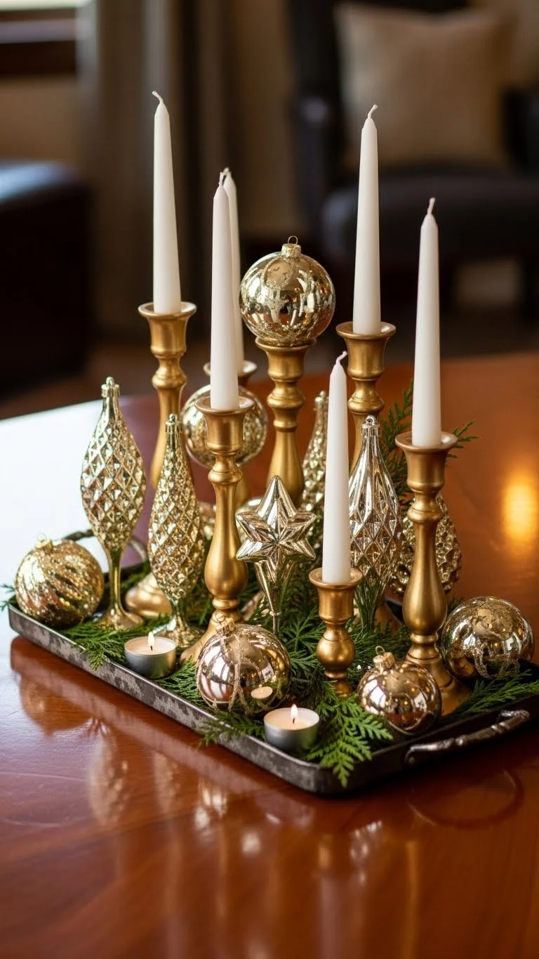 Arrange candles on a gold tray with ornaments and greenery for a polished centerpiece. The tray confines decor elements, making assembly easy. Mix textures and sizes for depth. This approach highlights gold accents while keeping the table organized and elegant, creating a festive focal point for holiday gatherings.