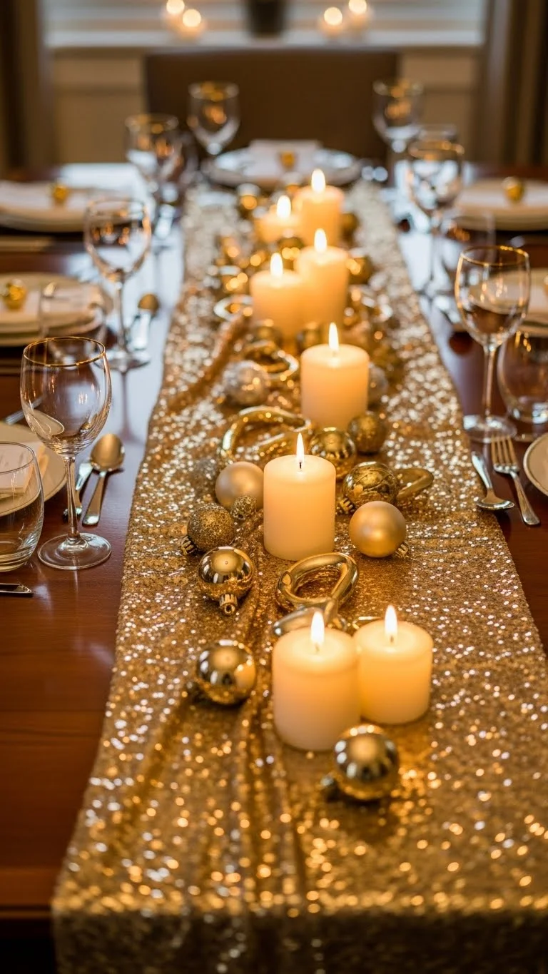 Create centerpiece bowls filled with gold baubles and candles for instant sparkle. Combine textures—glossy, matte, and glittered items—for depth. Add natural elements like pinecones or greenery to soften the metallic sheen. This is an affordable way to glam up your table while keeping the display easy to assemble and move as needed.