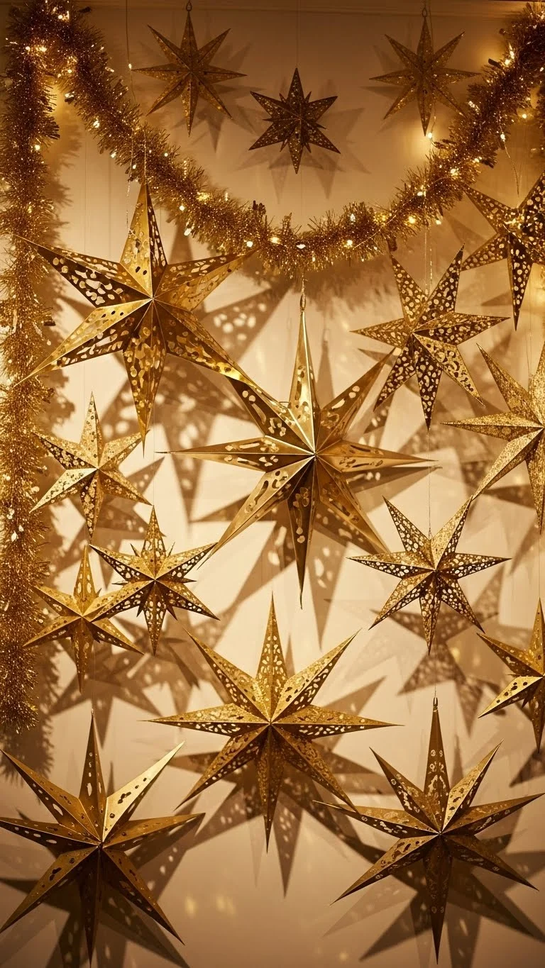 Add gold metallic wall art or DIY star garlands to infuse glamour without clutter. Hang above the mantel, bed, or entryway. Craft paper stars painted gold or use metallic foil accents for DIY options. Wall art draws the eye upward and complements other gold accents, creating a cohesive, luxurious holiday atmosphere.
