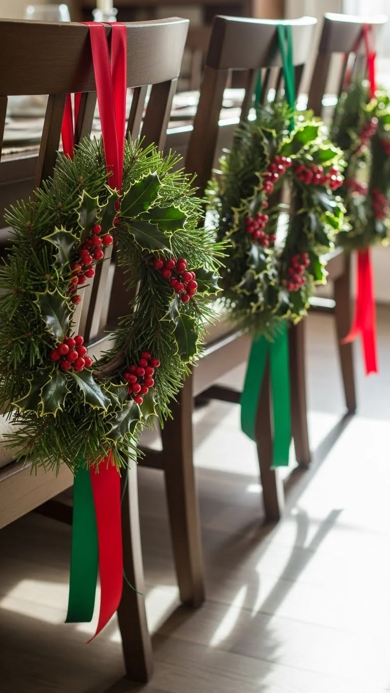 Hang small wreaths on the backs of dining chairs for added holiday charm. Use twine, ribbon, or wire to secure them, and add minimal embellishments like berries or tiny ornaments. This adds a cohesive, festive feel without taking up table space. Reuse the same greenery from your main wreaths or garlands for a consistent look. It’s a simple, low-cost detail that impresses guests.