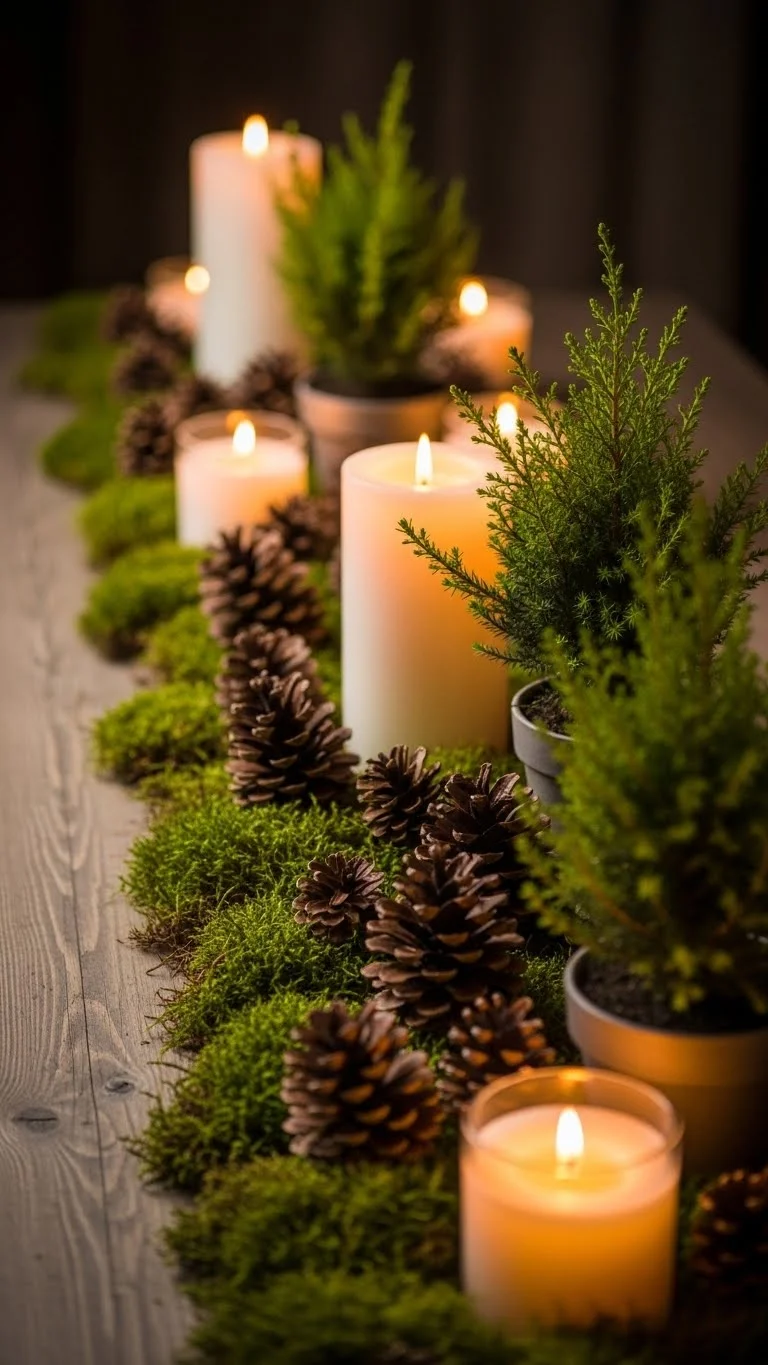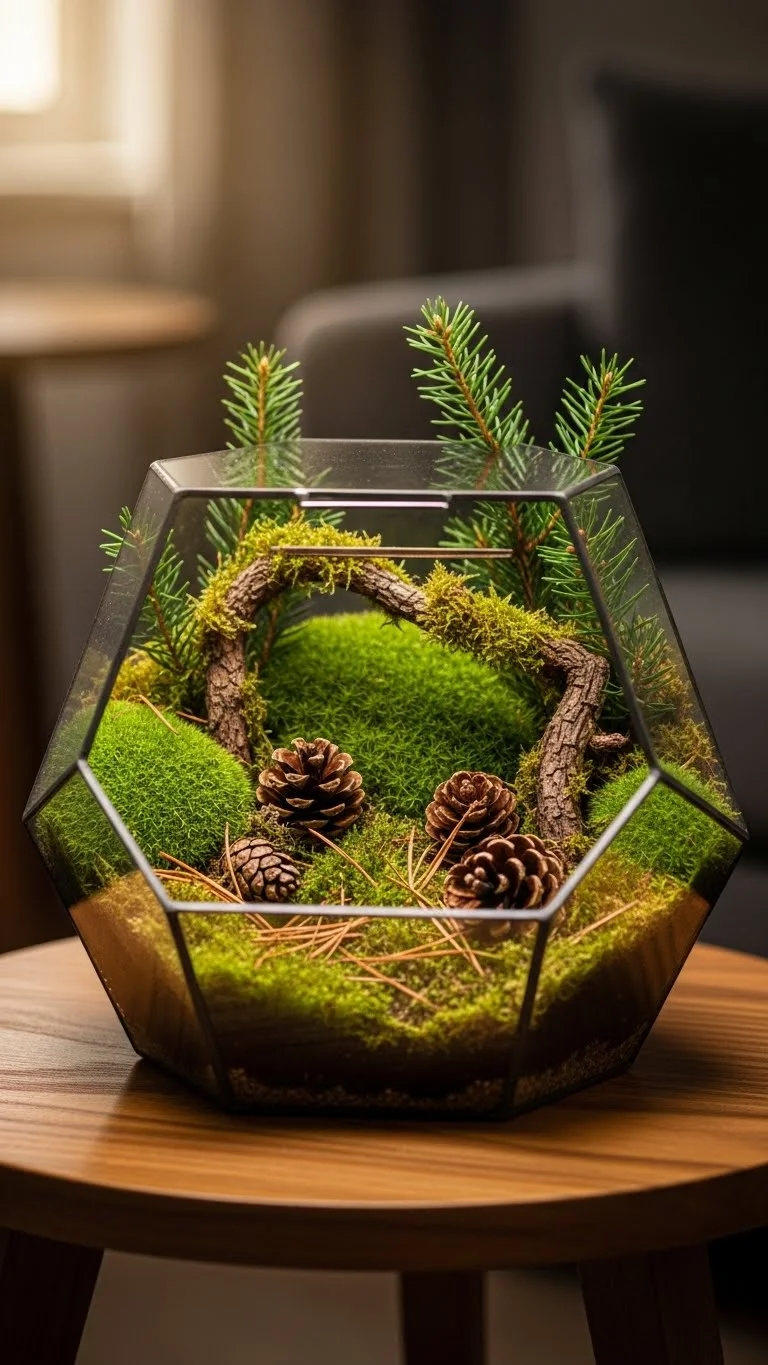 Fill glass terrariums with moss, pinecones, and greenery clippings for a compact, nature-inspired decoration. These terrariums work on side tables, shelves, or as part of a centerpiece. Layer textures for depth, and consider adding a small battery-powered light for a soft glow. Moss is inexpensive and easy to source, and the combination with natural elements creates a peaceful, woodland-inspired vibe.