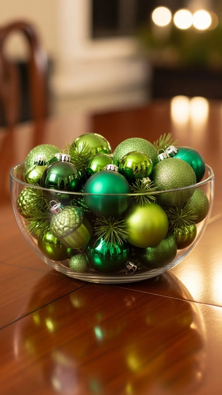 Fill a bowl with green ornaments and sprigs of greenery for a simple, elegant display. Use varying shades of green and textures to create visual interest. This setup is quick to assemble and easy to move or refresh. You can use glass, wooden, or matte ornaments depending on your aesthetic. Scatter a few pinecones or berries for additional depth without clutter.