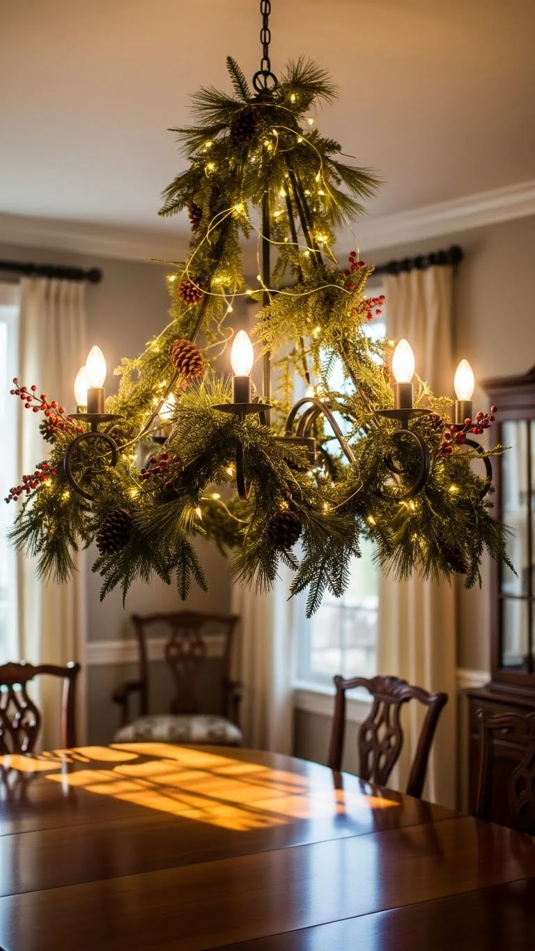 Wrap a chandelier or pendant light with fresh or faux evergreen garlands. Weave in string lights for a warm glow. This elevates your decor with minimal effort and draws attention upward. Secure the garland carefully to avoid contact with hot bulbs. The greenery adds a natural, festive feel to the room while keeping surfaces free.