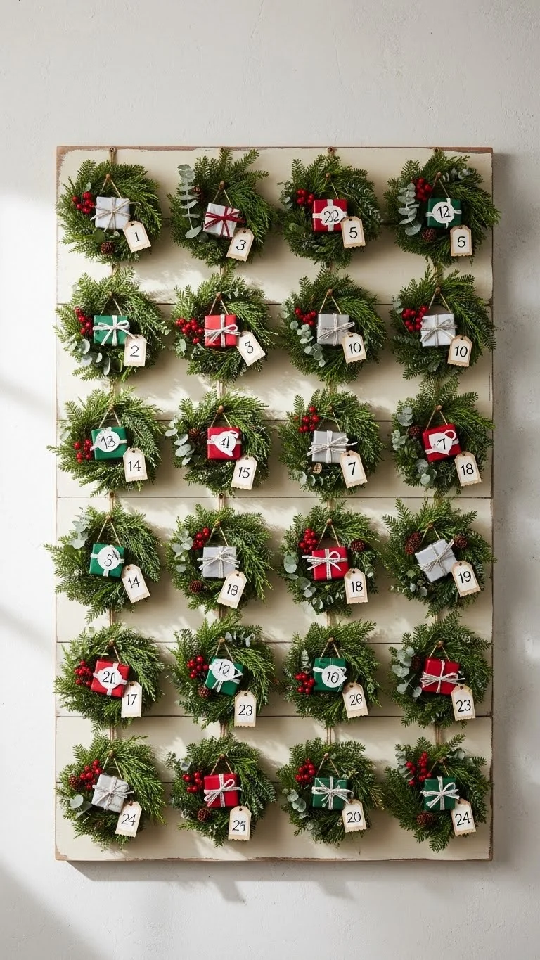 Create an advent calendar using small wreaths and greenery hung on a wall. Add numbered tags or mini gifts to each wreath. This DIY setup incorporates natural elements while giving daily surprises during the season. Use twine or ribbon to hang wreaths, and recycle greenery from other decor projects for cost efficiency. This functional decoration doubles as a festive wall feature.