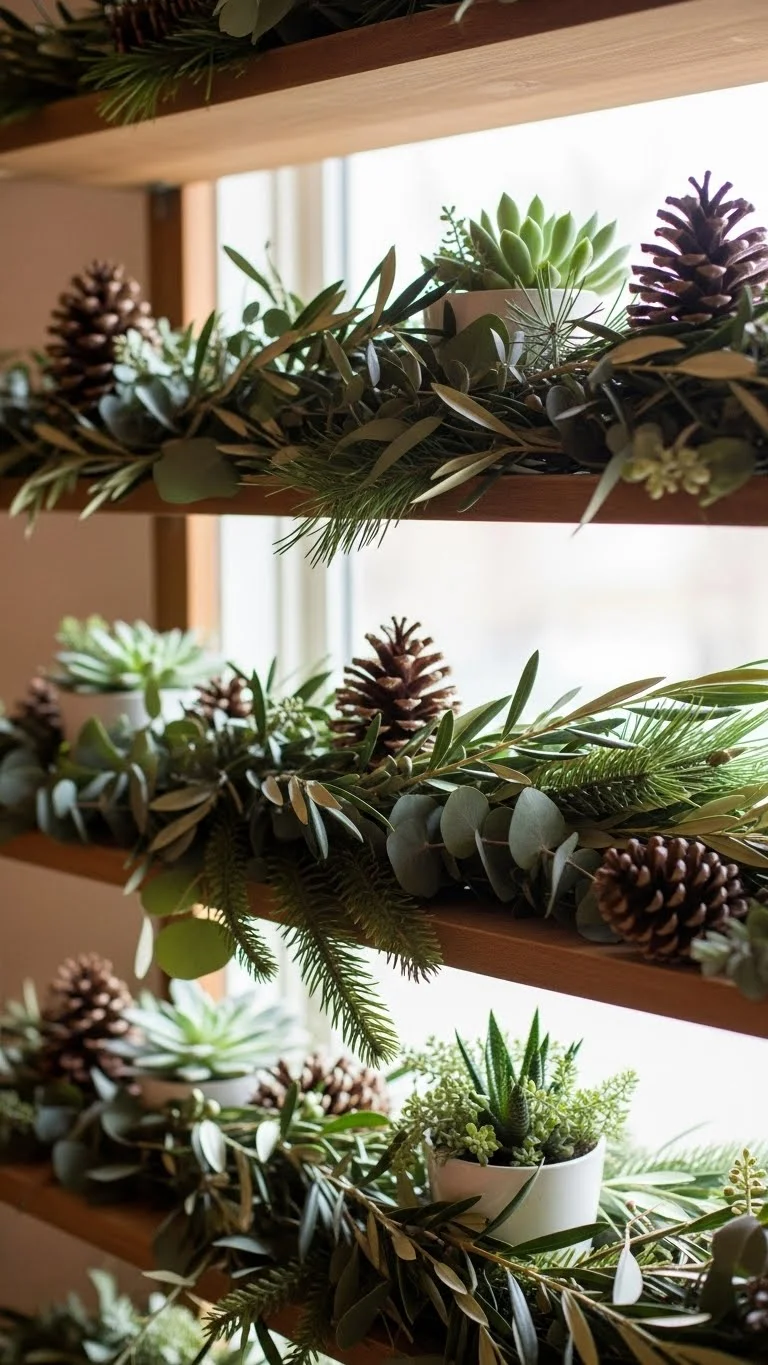 Layer garlands and potted greenery on shelves for a subtle holiday touch. Add small accents like pinecones, berries, or mini ornaments. This approach uses vertical space effectively and keeps surfaces uncluttered. Rotate elements with fresh clippings as needed to maintain vibrancy. Layering creates dimension and makes even simple shelves feel festive.