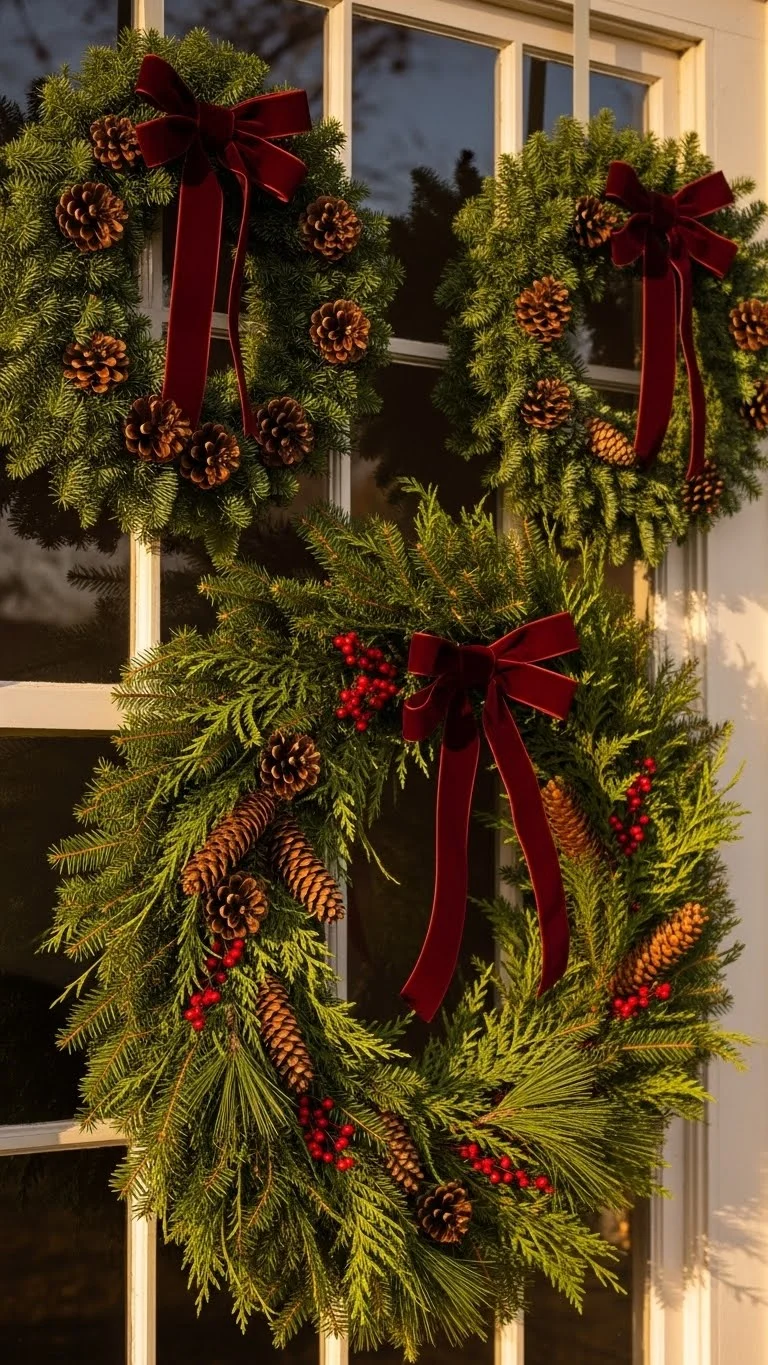 Hang greenery wreaths on windows for natural charm. Use suction cups or ribbons to avoid damaging surfaces. Add a few pinecones, berries, or ornaments for subtle accents. This decor idea is visible from both inside and outside, creating curb appeal and holiday cheer. Simple wreaths provide a timeless look and are easy to refresh annually.
