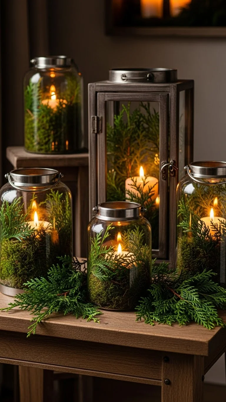 Fill lanterns with moss and small evergreen clippings for a natural tabletop display. Insert a candle or string lights for a cozy glow. This idea works well for side tables, mantels, or entryways. It’s compact, affordable, and combines greenery with warm light for seasonal ambiance. Swap moss for pine needles for variation in texture.