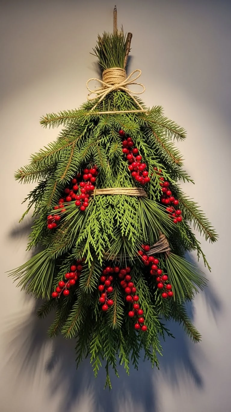 Create a wall hanging from layered evergreen branches for a natural statement piece. Secure branches with twine and add minimal decorations like berries or ribbon. Hang above a fireplace, bed, or console table. This DIY project is simple, low-cost, and brings fresh greenery into your home. Its vertical design adds interest without taking up floor space.