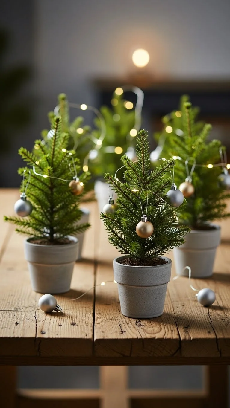 Place mini potted evergreens on tables, shelves, or windowsills for a natural, versatile look. Decorate sparingly with a few ornaments or leave them plain to emphasize greenery. These mini trees can double as gifts for guests or be repurposed after the season. Choose pots in neutral tones or rustic finishes to complement any home decor. Adding moss or a burlap wrap can enhance the woodland vibe.