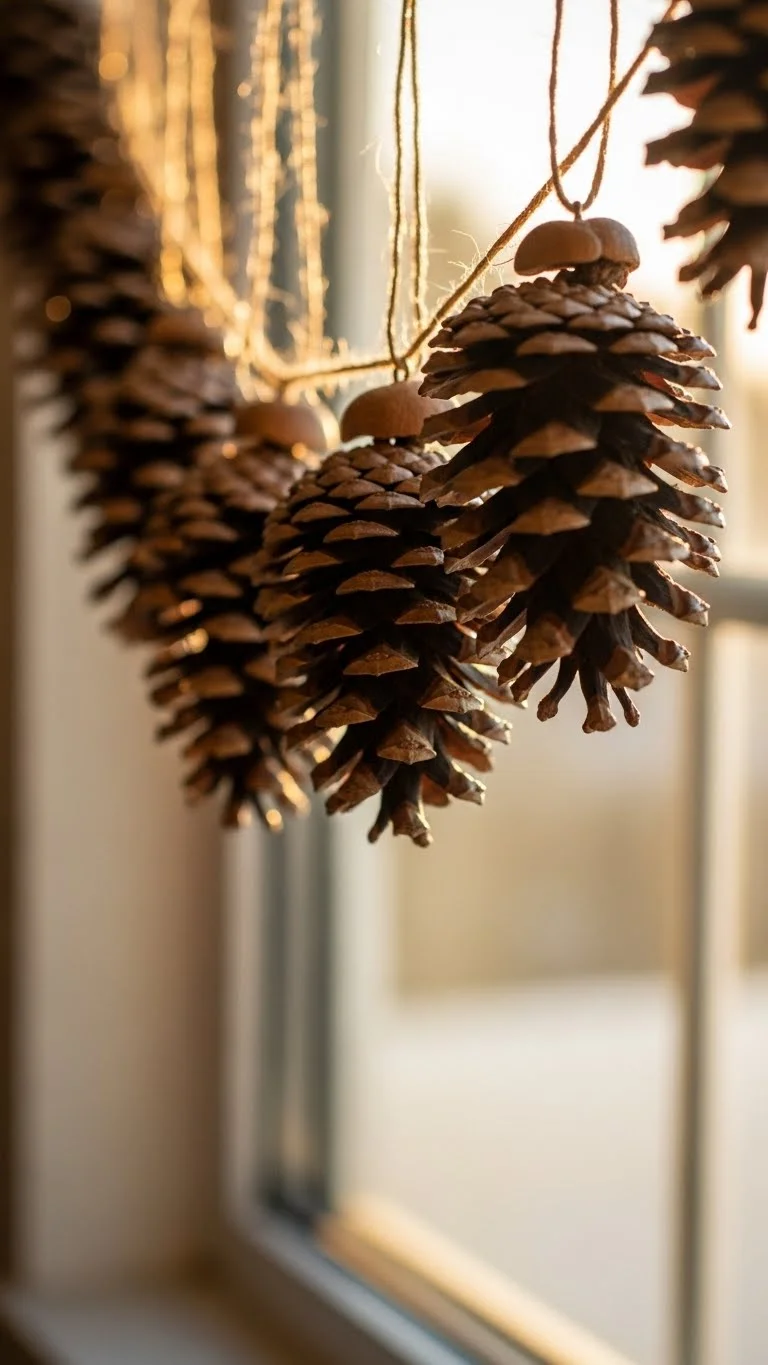 Create a pinecone garland for mantels, doorways, or windows. String pinecones together with twine or ribbon and add greenery or lights. This natural element is easy to DIY and adds rustic charm. Collect pinecones outdoors or purchase them in bulk for convenience. Pinecone garlands are lightweight, budget-friendly, and provide texture alongside other greenery decorations.