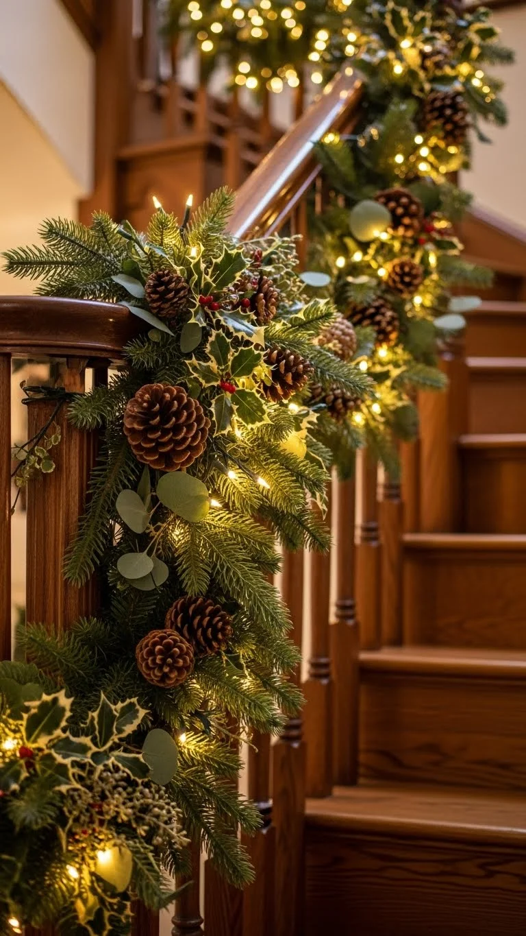 Line your staircase railing with green garlands for a dramatic, festive statement. Secure with ribbon or hooks, and weave in pinecones, lights, or small ornaments. This natural approach keeps the home welcoming without overwhelming the space. Adjust the density of the greenery depending on your style: loose and flowing for rustic charm, or tight and uniform for a polished look.