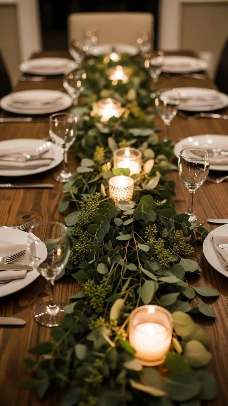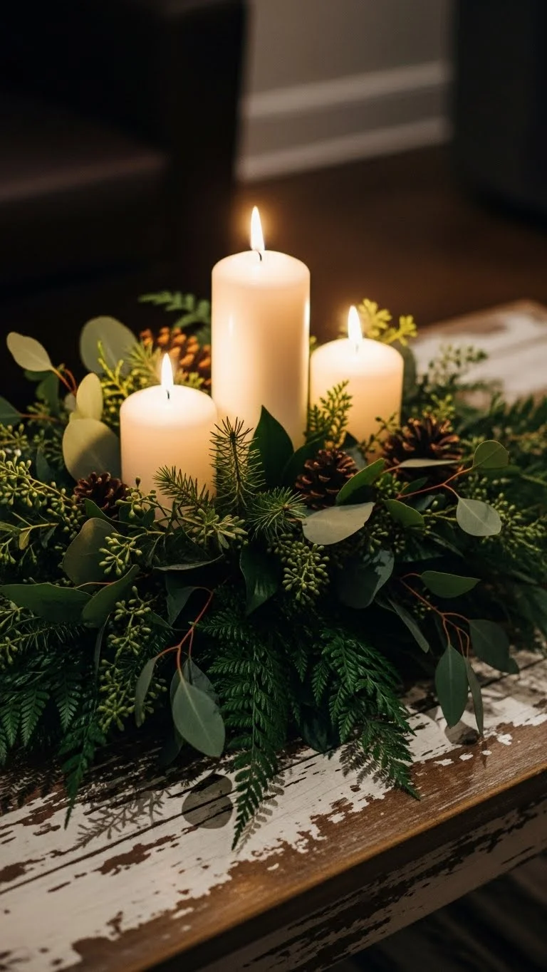 Combine greenery with candles to create a warm, inviting centerpiece. Place greenery flat on a tray or table runner, then nestle pillar candles or tealights among the foliage. The mix of natural green tones with flickering light adds a festive mood. Choose unscented candles if the greenery already has a fragrance, and consider layering in a few berries or ornaments for subtle color.