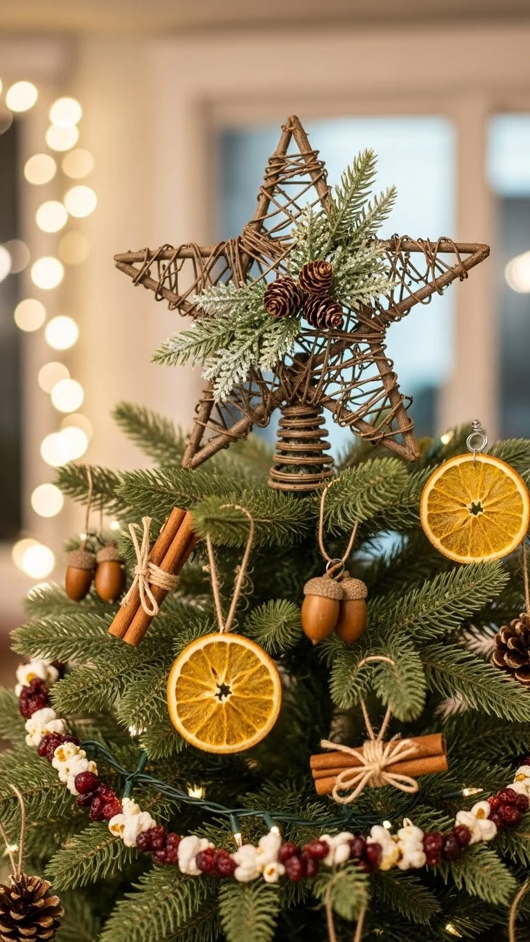 Craft a tree topper using twigs, greenery, or pinecones for a nature-inspired finish. Secure materials with floral wire or string and place at the top of your tree. This DIY approach uses simple, natural items and adds a rustic charm. Pair with green and neutral ornaments to keep the look cohesive. It’s an affordable way to personalize your tree and highlight natural textures.