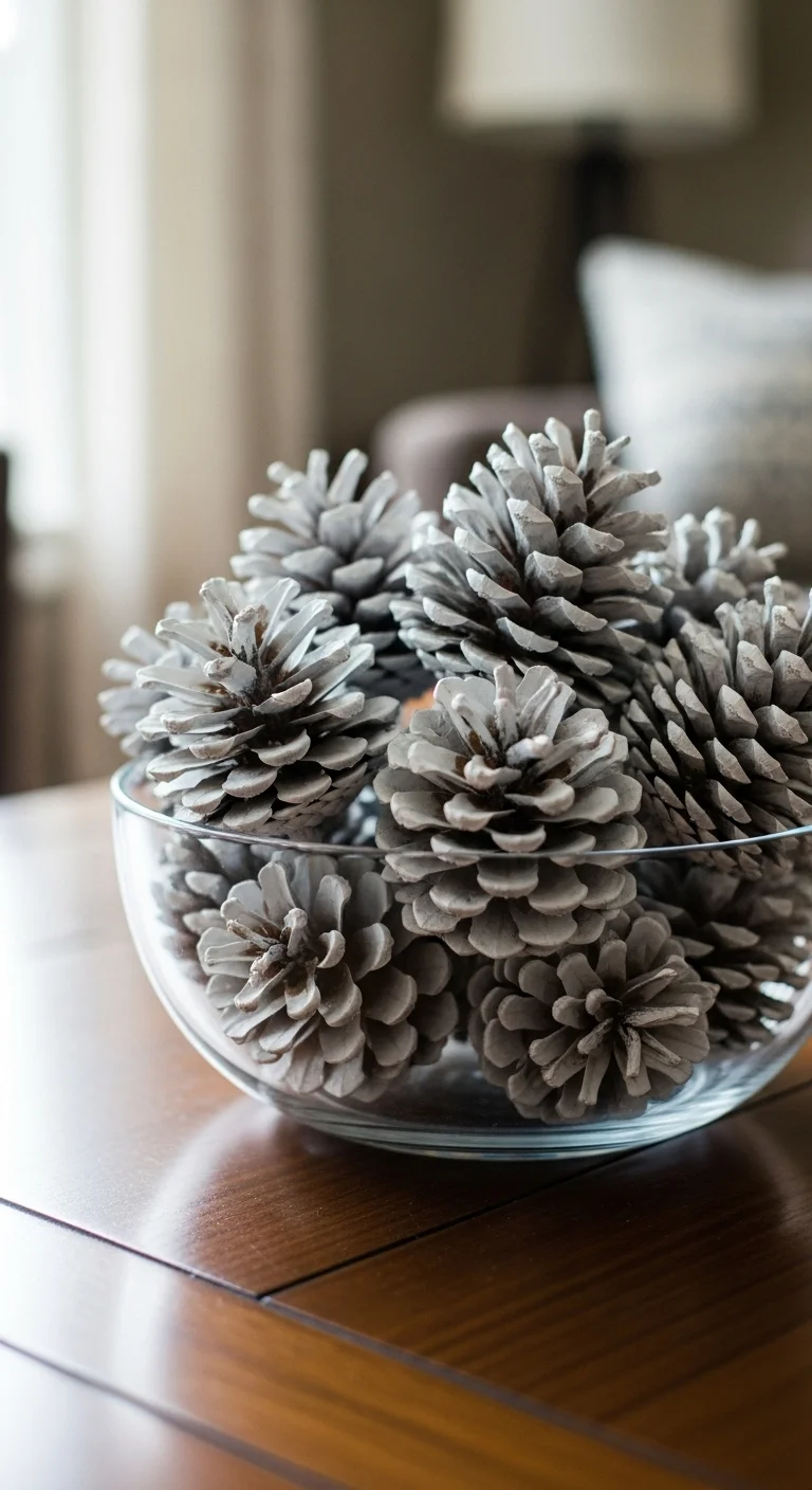 Collect pinecones and paint their tips white or sprinkle a bit of glitter for a frosted effect. Place them in bowls, baskets, or glass jars. It’s a simple, free DIY that adds texture and ties your decor together beautifully.