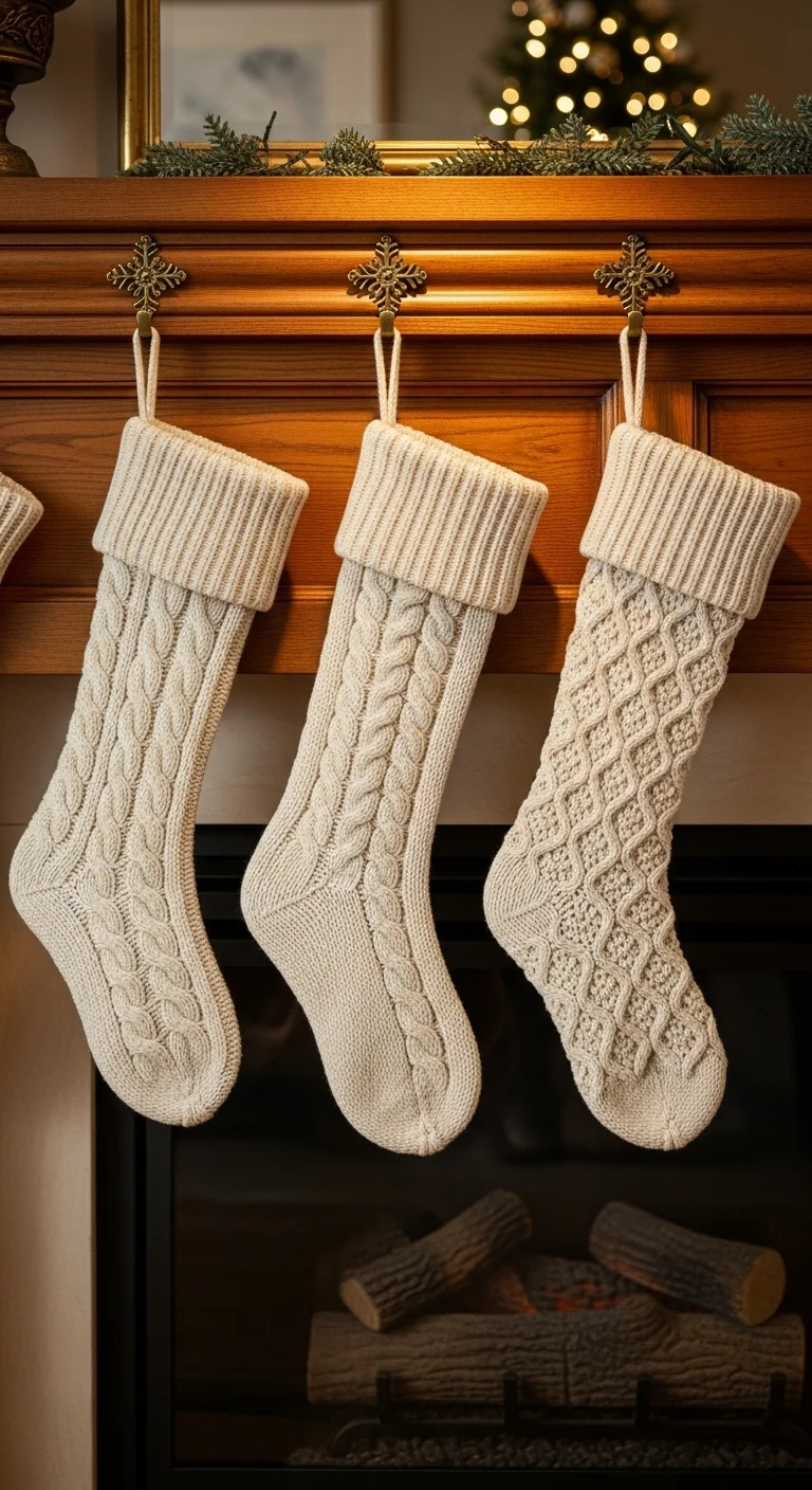 Hang knit stockings in soft neutrals like ivory or gray. They bring texture and charm. You can personalize them with small wooden name tags or leather loops for a rustic finish.