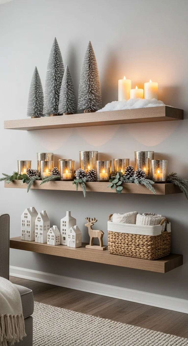 Decorate your shelves simply. Add mini trees, candles, and small wooden houses. Keep the color palette soft — whites, browns, and greens. Too many decorations can feel busy, so let each item have space to stand out.