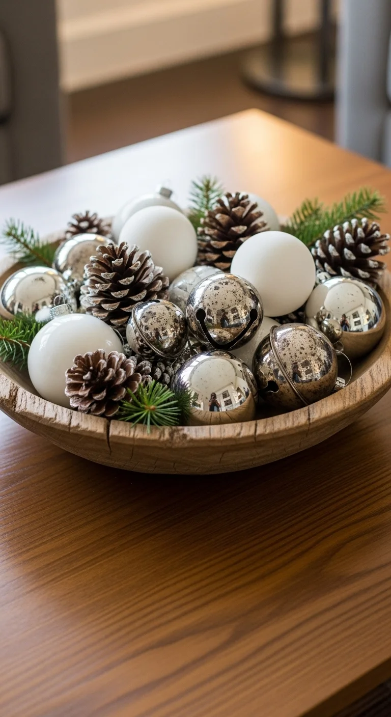 Fill a bowl or tray with extra ornaments and pinecones. It’s a quick way to add Christmas charm to your coffee table. Choose colors that match your decor for a polished look.