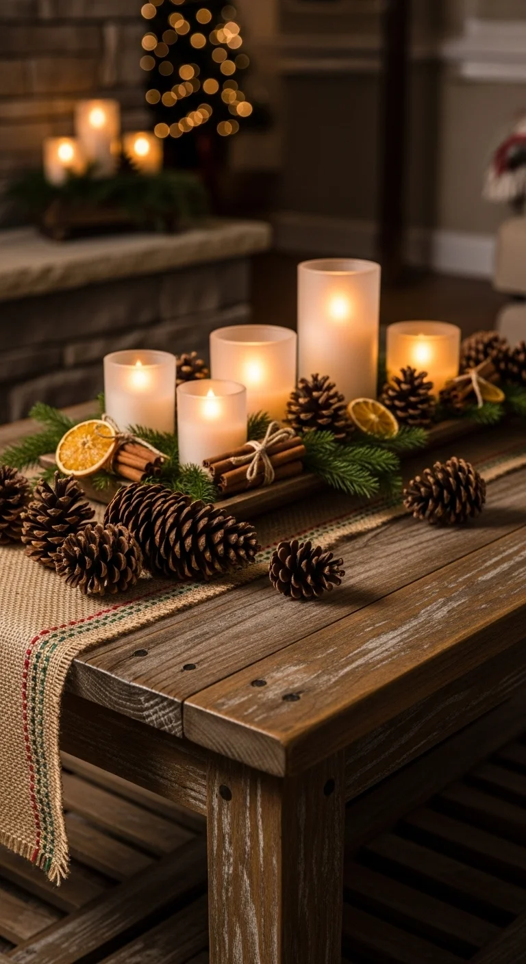 Bring in wooden elements for a rustic touch. Think wood trays, small logs, or wooden reindeer figurines. They add warmth and balance to softer textures. You can even repurpose old wood planks into DIY wall art or a serving board centerpiece.