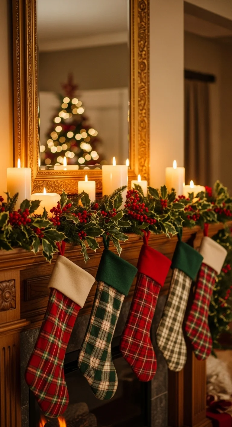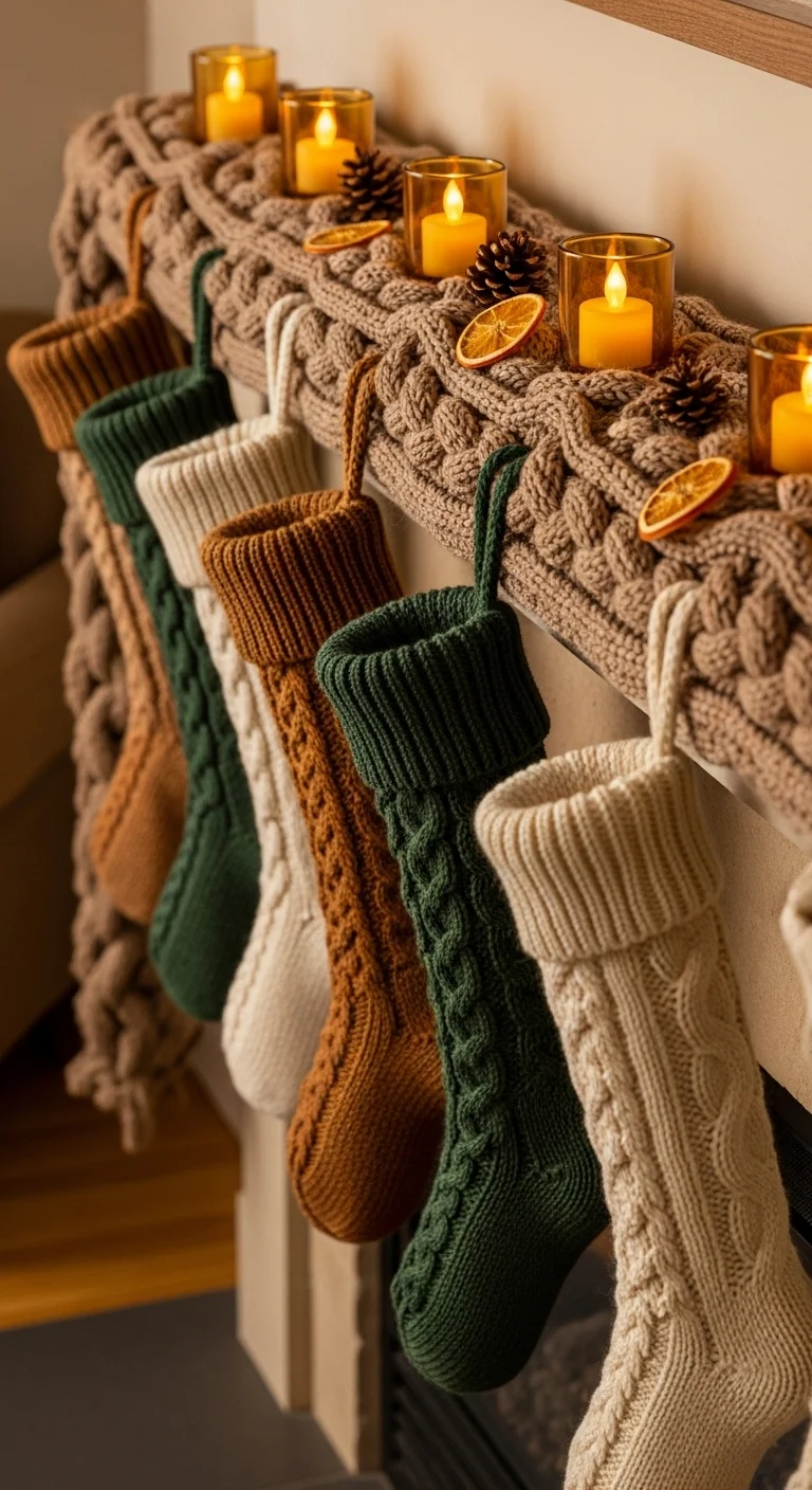 Make stockings the centerpiece. Choose different fabrics and textures like velvet, knit, or linen. Hang them with care using uniform hooks or ribbon. Mix patterns but keep tones cohesive. Personalized name tags add a thoughtful touch.