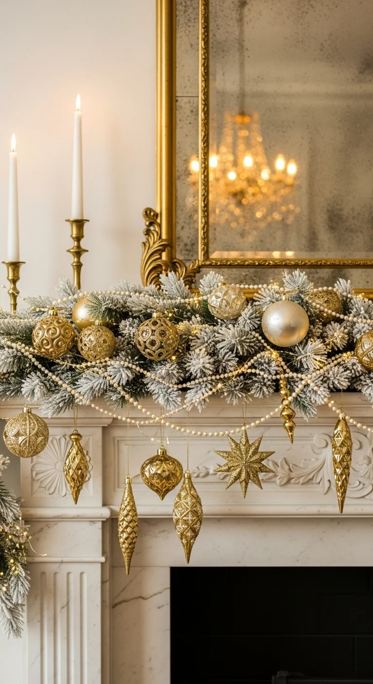 For a luxurious feel, combine gold, ivory, and white tones. Drape a pearl garland over the mantle, then add candles and ornaments in metallic hues. A large mirror or artwork with gold trim completes the scene. You can spray-paint dollar-store ornaments to mimic high-end décor affordably.