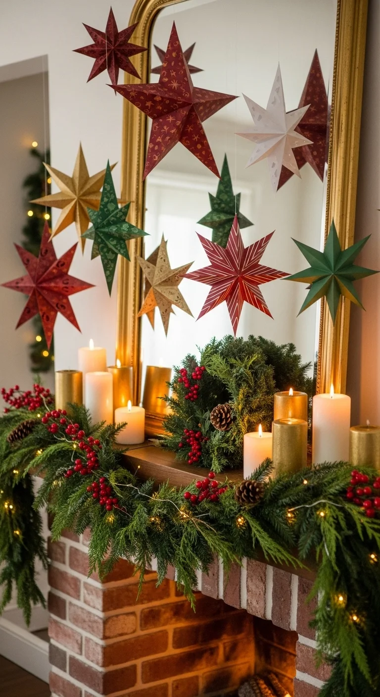 Paper stars are easy, elegant, and fun to make. Hang them from your mantle using clear fishing line. Choose white, gold, or metallic paper. Pair with minimal greenery and candles. This DIY costs next to nothing but looks stunning.