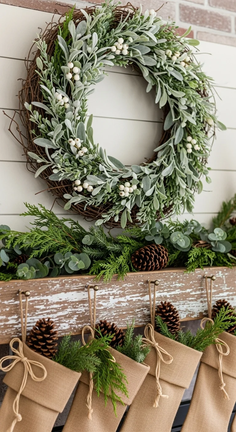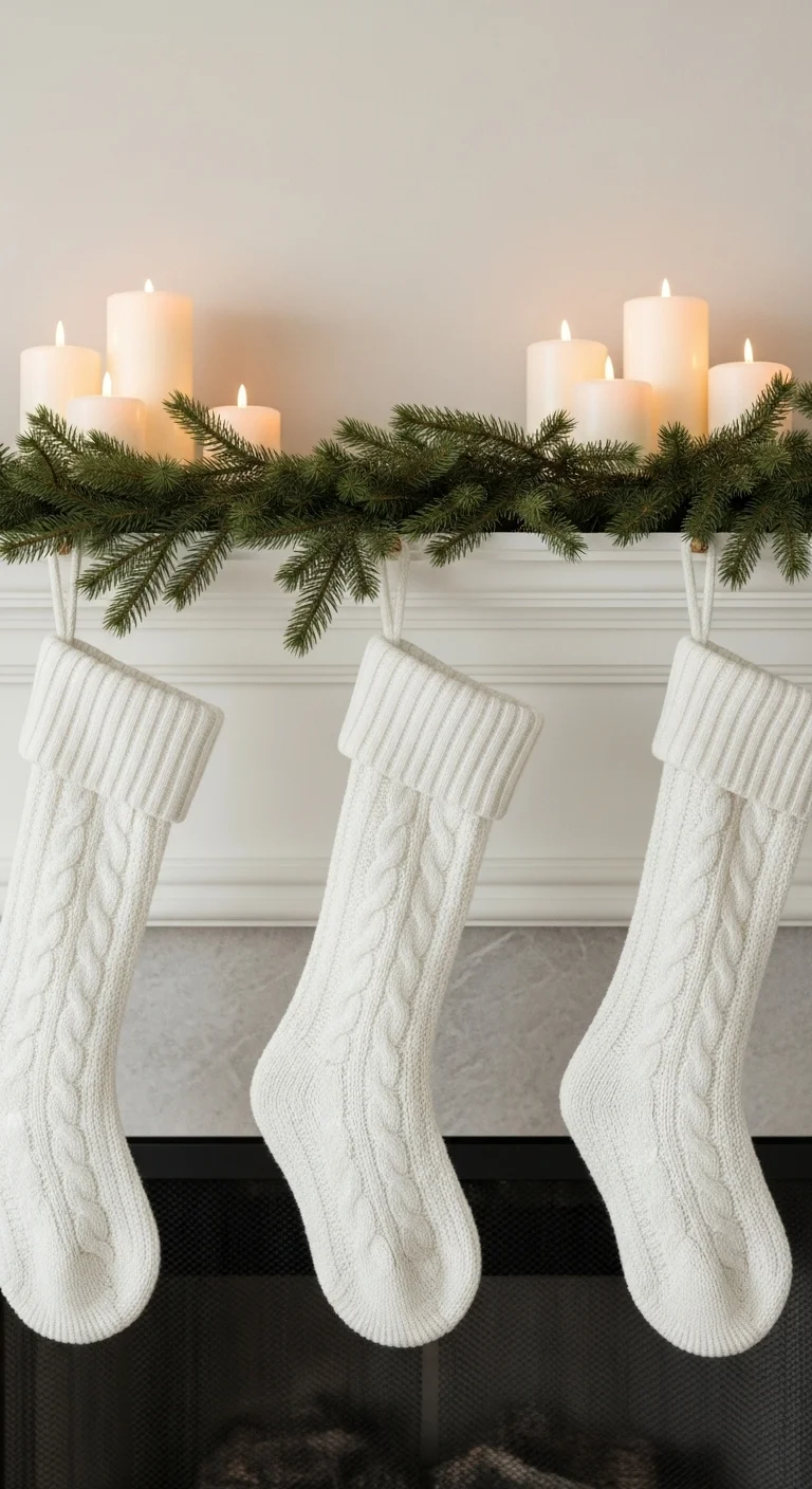 Create a serene atmosphere with white and beige tones. Hang chunky-knit or fur stockings in soft hues. Add a pine garland dusted with faux snow for texture. Use minimal ornaments—perhaps a few silver bells or white berries. This palette feels calm, cozy, and sophisticated. Affordable faux fur stockings or DIY knitted versions make this style easy on your budget.