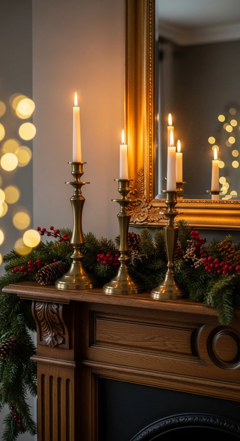Channel old-world charm with brass candlesticks and taper candles. Scatter them across your mantle with varying heights for balance. Add greenery and berries in between for color. This look feels timeless and cozy. Pick up thrifted brass holders and mix candle colors like cream, wine red, and olive green. It’s romantic, nostalgic, and affordable.