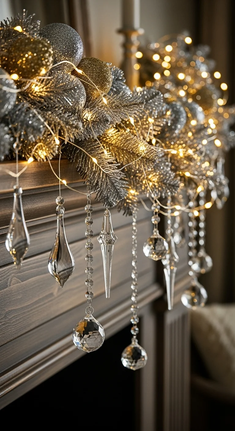 For a regal twist, decorate your mantle in silver and icy blue. Use metallic garlands, frosted pine, and blue glass ornaments. Clear glass vases filled with fairy lights add sparkle. This combination feels crisp and modern. Dollar-store glass ornaments can easily achieve this look without stretching your wallet.