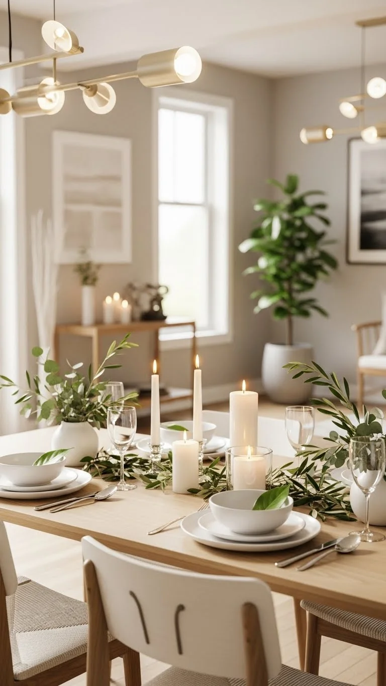 Set your table with white plates, silver cutlery, and small greenery sprigs. Keep everything symmetrical and neat. Add a linen runner instead of a full tablecloth. For a personal touch, tie napkins with twine and a small pine twig.