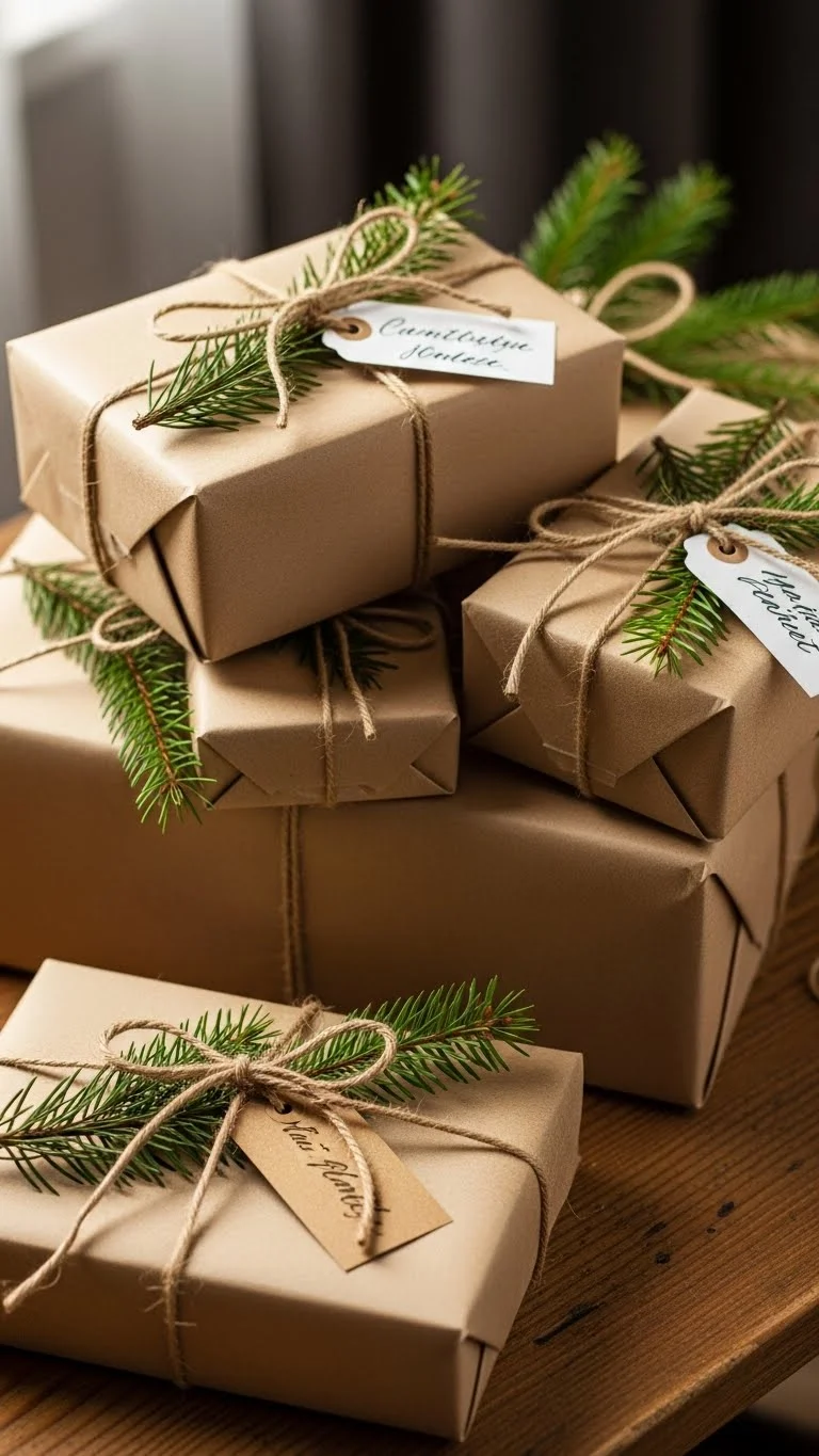 Wrap gifts in brown kraft paper or plain white paper. Tie them with twine or jute string. Decorate each with a pine branch or dried orange slice. It’s affordable, coordinated, and visually calming under the tree.