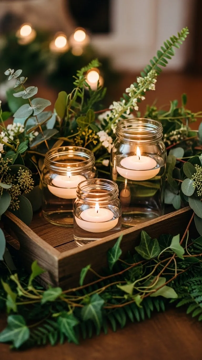 Create a floating candle centerpiece using glass jars filled with water. Place a tea light in each. Cluster them on a tray with greenery or pinecones. It’s soft, glowing, and very minimalist-friendly.