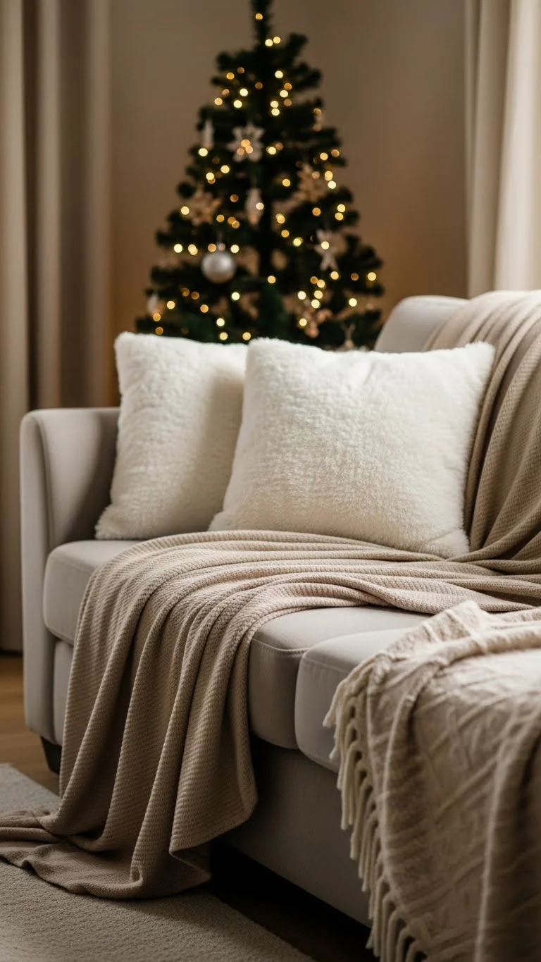 Bring warmth through soft textures—chunky knit throws, wool pillows, or faux fur rugs. Stick to whites, creams, and grays. These pieces make your space cozy without adding visual clutter.