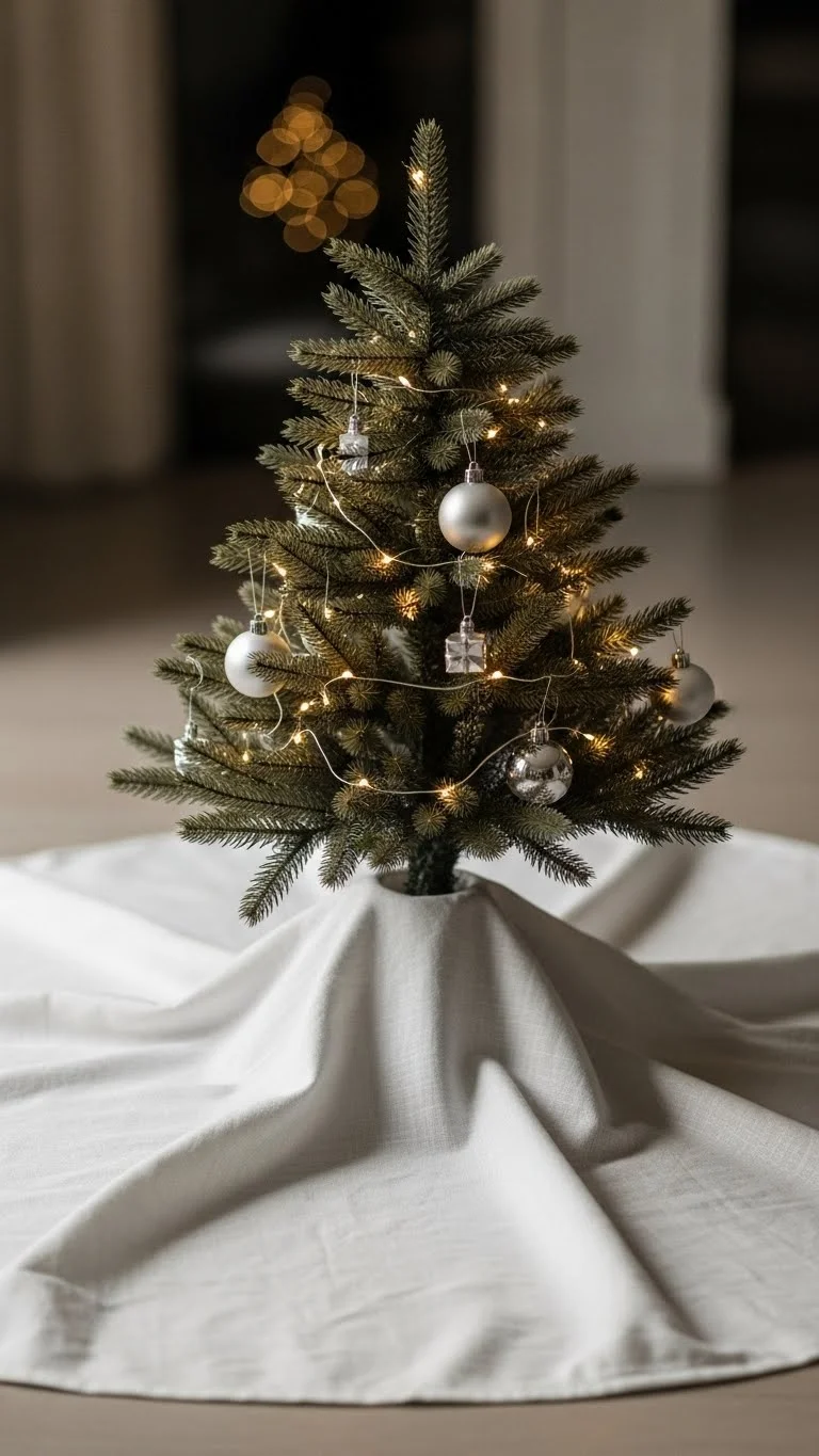 Choose a plain tree skirt in linen or cotton. Avoid sequins or heavy patterns. White, beige, or gray work beautifully. For a quick alternative, fold a neutral blanket neatly around the base.