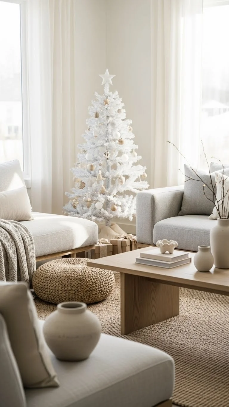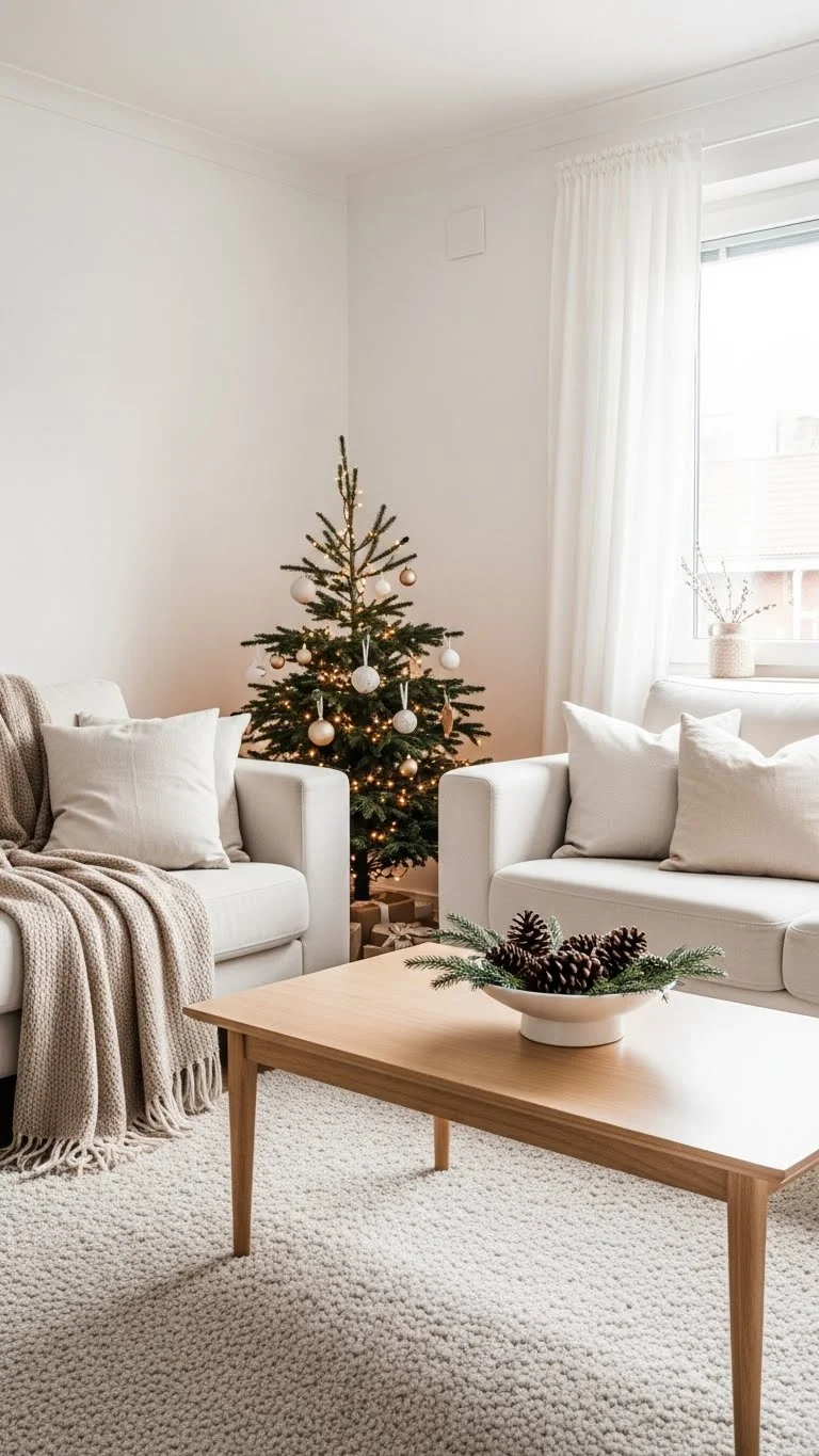 Keep your entire color scheme cohesive. Use whites, taupes, grays, and natural greens throughout. When every element feels connected, your space looks calm, modern, and timeless—perfect for a minimalist Christmas mood.