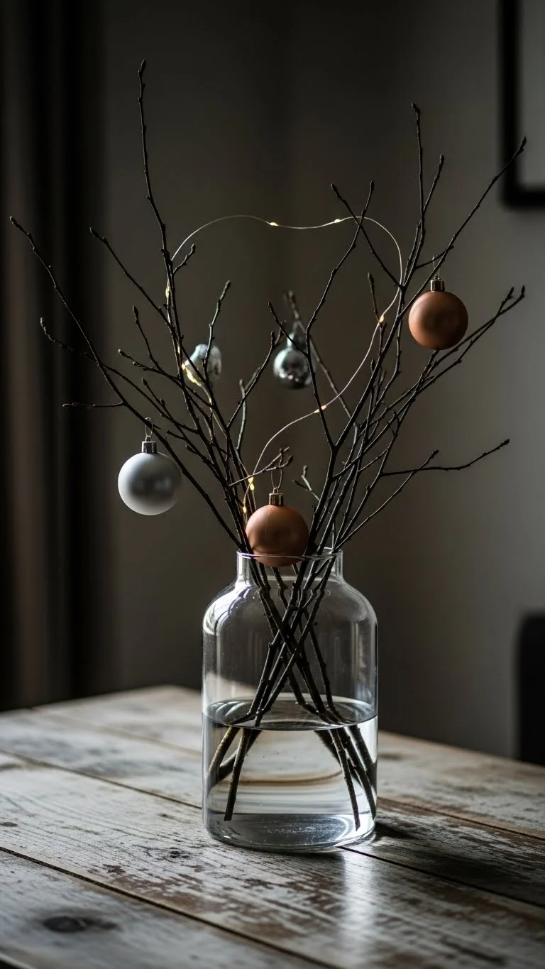 Use bare winter branches instead of a full tree for a striking minimalist statement. Place them in a clear vase and hang a few ornaments sparingly. You can spray the branches white for a frosted touch. It’s simple, elegant, and ideal for small spaces.
