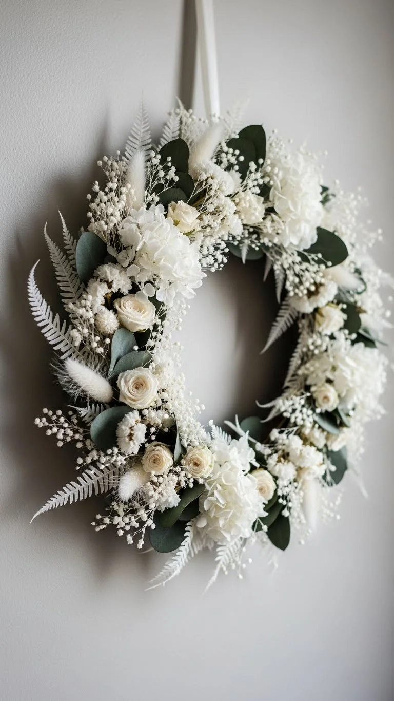 Choose or make a white wreath for your door or wall. You can use dried flowers, pampas grass, or faux snow-covered branches. It’s understated and elegant. A thin ribbon in beige or cream adds a polished finish.