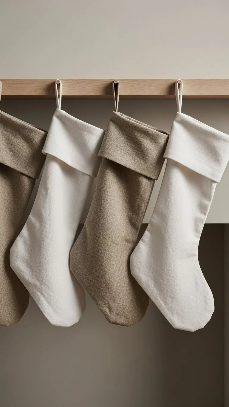Hang neutral linen stockings without bold prints. Use simple wooden hooks or clips. Keep the stockings evenly spaced and in a single color family. Add small name tags made from wood or craft paper for a personal touch.