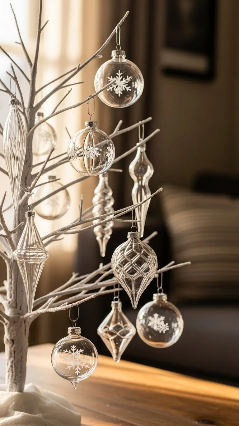 Use clear glass baubles to create an airy, modern feel. Fill some with dried leaves or faux snow for variation. They catch the light beautifully and look chic on smaller trees or table arrangements.