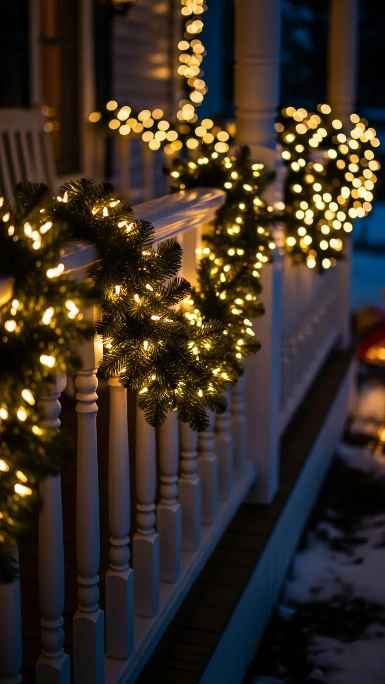 Lighted garland gives your railings texture and glow. Wrap the garland around the railing, weaving the lights throughout. Choose pre-lit garland for faster setup. If you want to stretch your budget, buy plain garland and add one single string of lights. Use zip ties to keep everything in place. If your railing is long, allow the garland to drape slightly for a natural look. Add small bows or pinecones for extra charm.