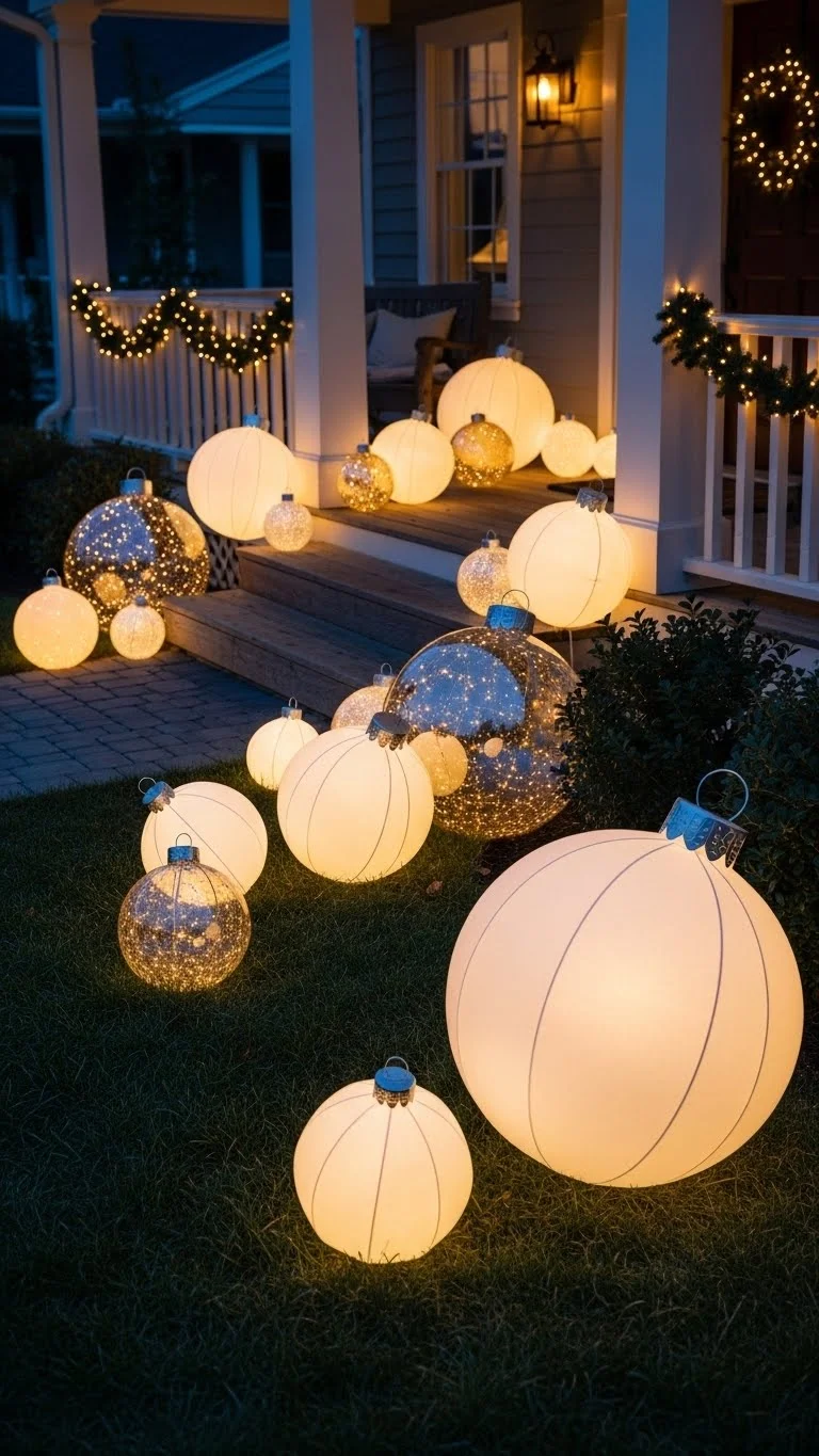 Oversized ornaments bring a playful touch to your yard. Place them under trees, near steps, or beside the driveway. Many versions come pre-lit, but you can make your own using large plastic balls and battery LED packs inside. Choose bright colors that stand out at night. If you want a more polished look, group them in threes. They become an easy statement piece without much work.
