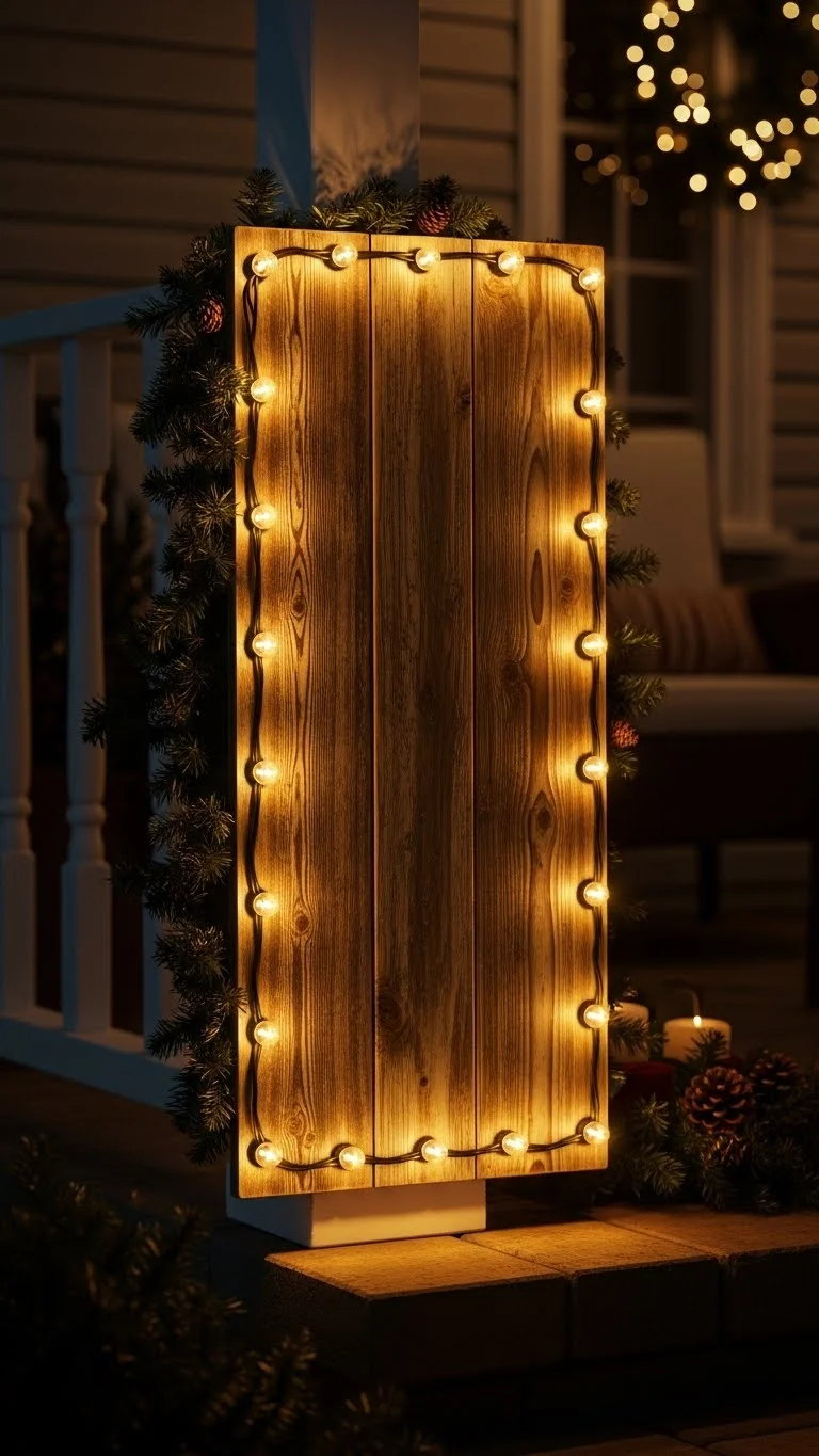 A lit porch sign adds personality to your holiday entrance. Use a simple wooden board and wrap mini lights around the frame. Set it beside the door or lean it against a wall. This is an easy DIY project using scrap wood and a basic light strand. If you prefer a softer glow, place fairy lights behind a frosted panel. Keep the sign simple so the lights stand out.