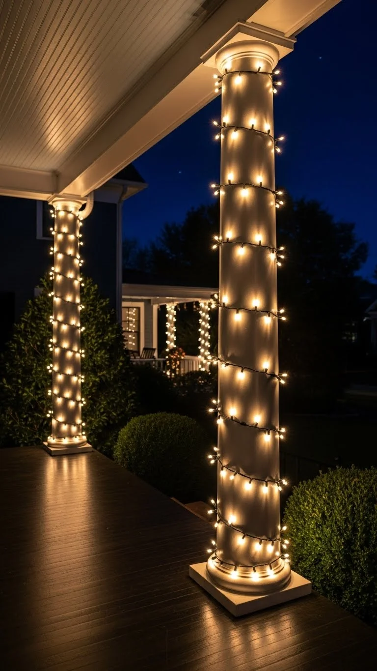 Wrapping porch columns adds a bright, welcoming focal point to your entrance. Start at the bottom and work upward in a gentle spiral. Keep the spacing even so the wrap looks tidy. If your columns are wide, use two strands twisted together for better coverage. You can combine warm white with red or green if you want more color. Try using zip ties or small hooks to keep everything secure in windy weather. If you’re working with a tight budget, wrap only the front-facing columns—they still make a strong impact. Pair the lights with a simple garland for a soft, classic look.