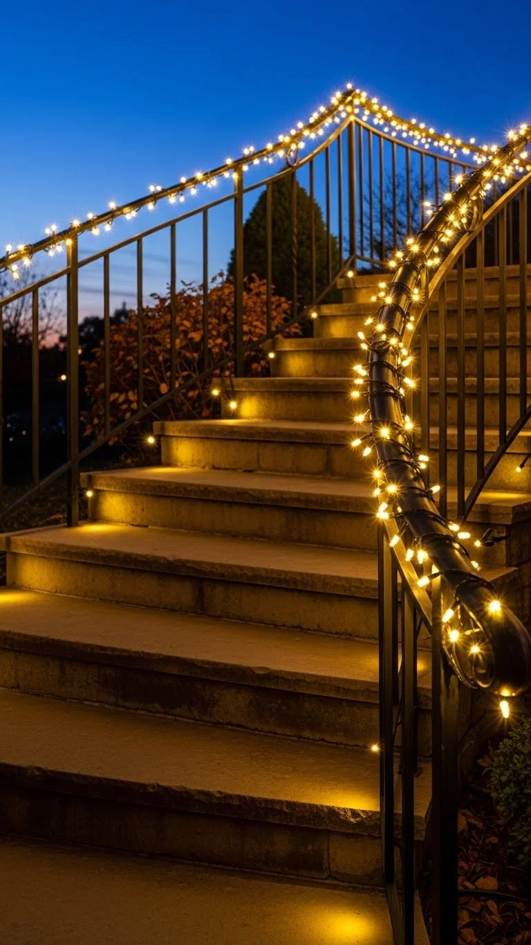 Wrapping your outdoor staircase rail adds both beauty and safety. Use mini lights for a balanced glow. Wrap them evenly up each banister. Add a bit of greenery if you want a fuller look. This project is quick and doesn’t require many materials. If your steps are wide, light only the main rail for a similar effect. This simple touch brightens your entrance with very little effort.
