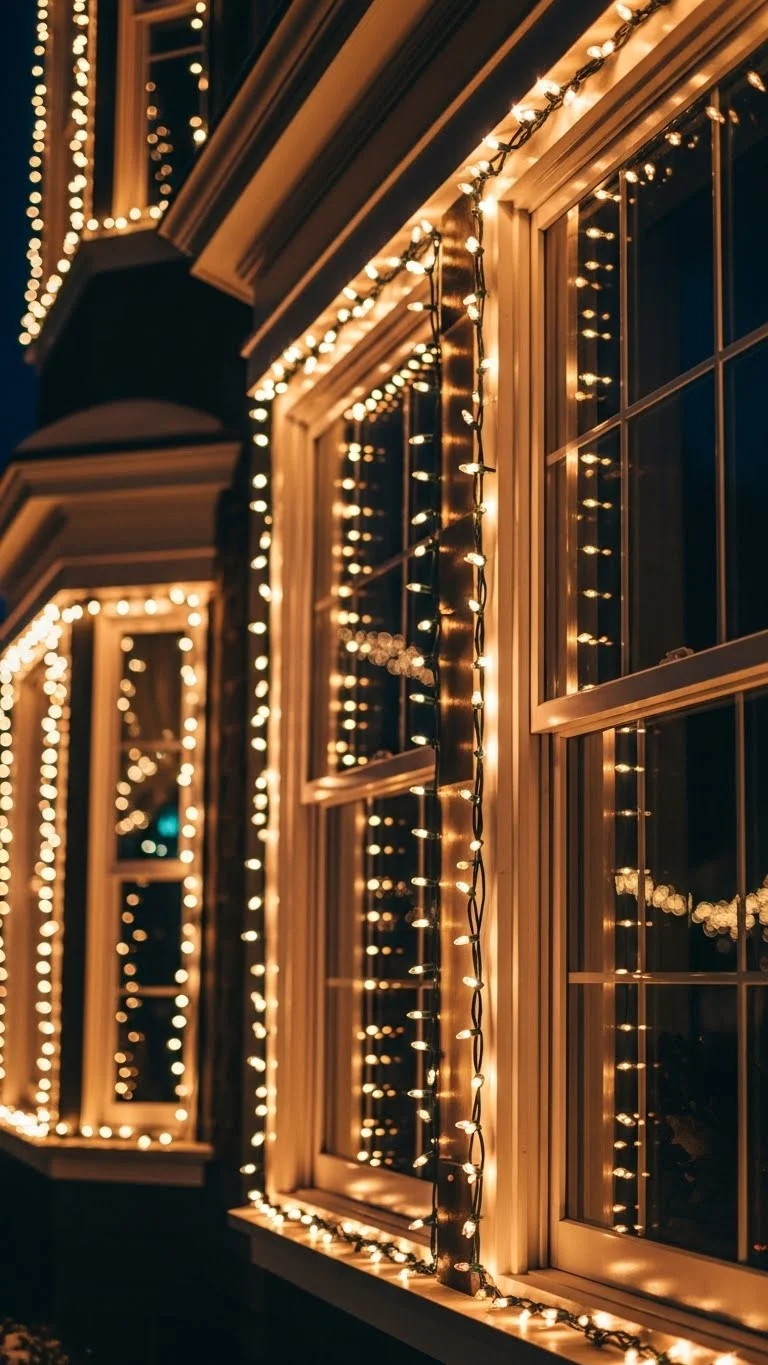 Framing your windows with lights gives your home a polished, balanced style. It creates a symmetrical glow that stands out beautifully at night. Use adhesive clips to attach lights without damaging the frame. Choose smaller bulbs if your windows are narrow. For a budget-friendly approach, only frame the front-facing windows. Add battery-powered candles on the inside for a layered warm effect. If your home has shutters, run the lights along the outer edges to widen the look. This simple setup makes your house appear bright and cheerful from the street.