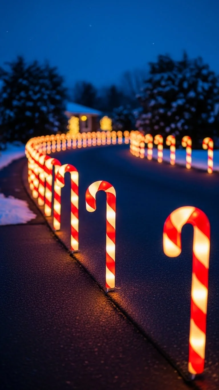 Candy cane lights make your yard feel cheerful and playful. Stake them along the driveway or walkway at equal distances. If you’re on a budget, place them only on one side and still get a great effect. Many sets link together, making setup simple. For a DIY option, spray-paint PVC pipe and wrap it with red tape, then add a small battery light on top. These homemade versions still look bright and festive at night.