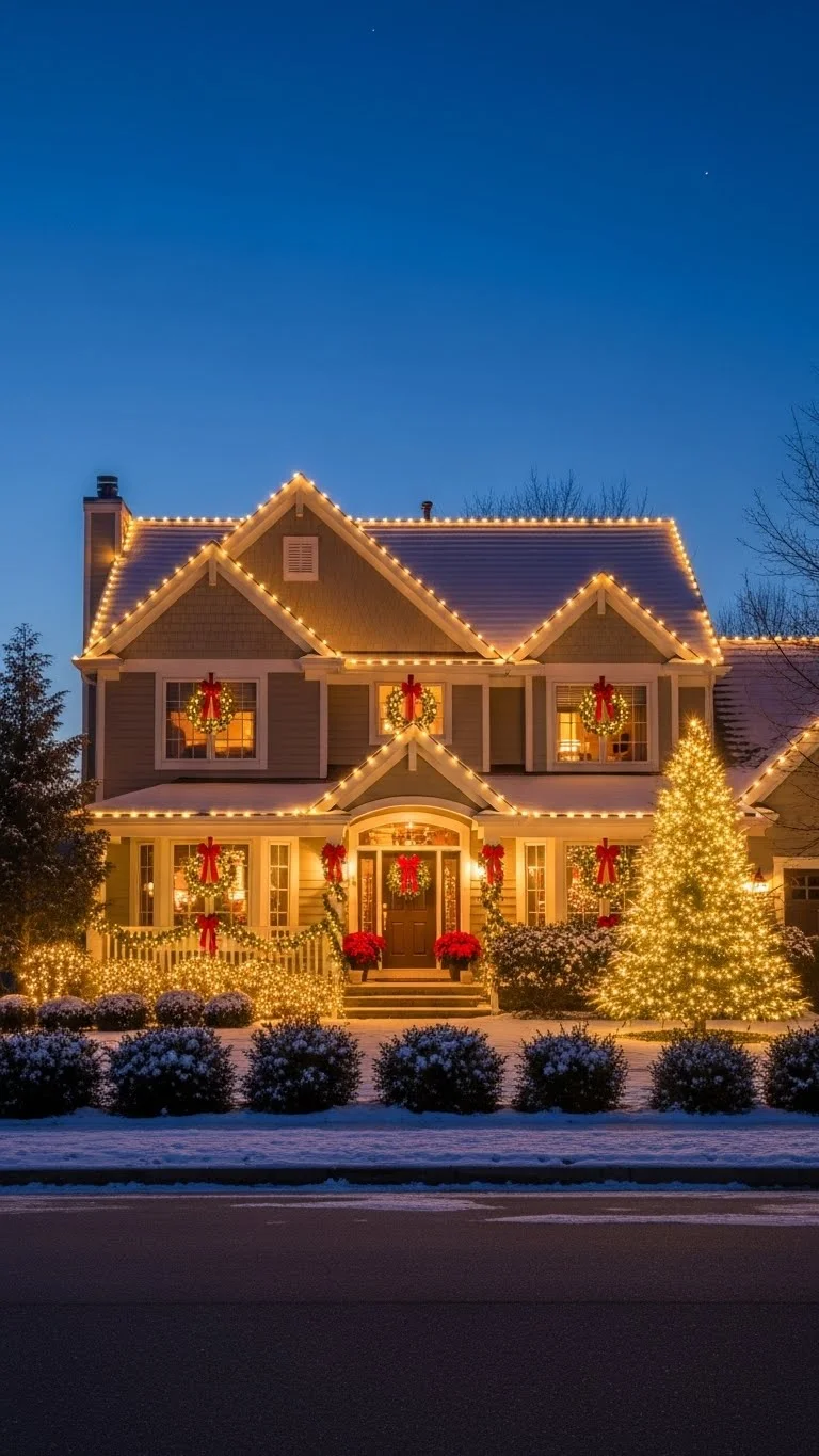 Icicle lights create a beautiful winter-drip effect across your home. They look especially striking on multi-story houses. Hang them along gutters or railings. Keep the strands at the same height for a clean look. Choose cool white if you prefer a frosty style or warm white for a softer feel. If you’re on a budget, hang icicle lights only across the main front section of your house. Test the lights on the ground before hanging so you can spot dead bulbs early.
